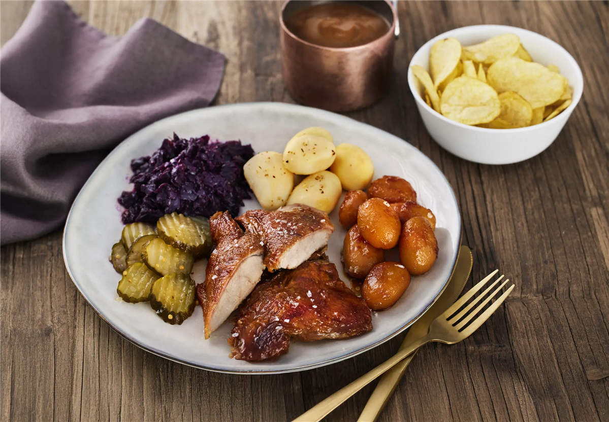 Fredag: Flæskesteg med brun sauce, kartofler og rødkål.