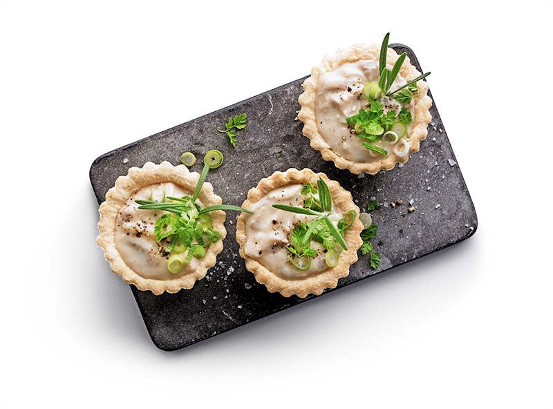 Kyllingebryst med bacon i tern, ananas, karrydressing og flutes