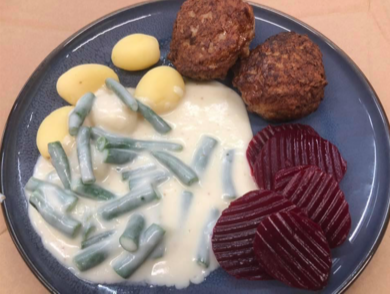 Kalvesteg stegt som vildt med waldorfsalat, agurkesalat, tyttebær, æble med gelé, bønner, hvide kartofler og vildtsauce